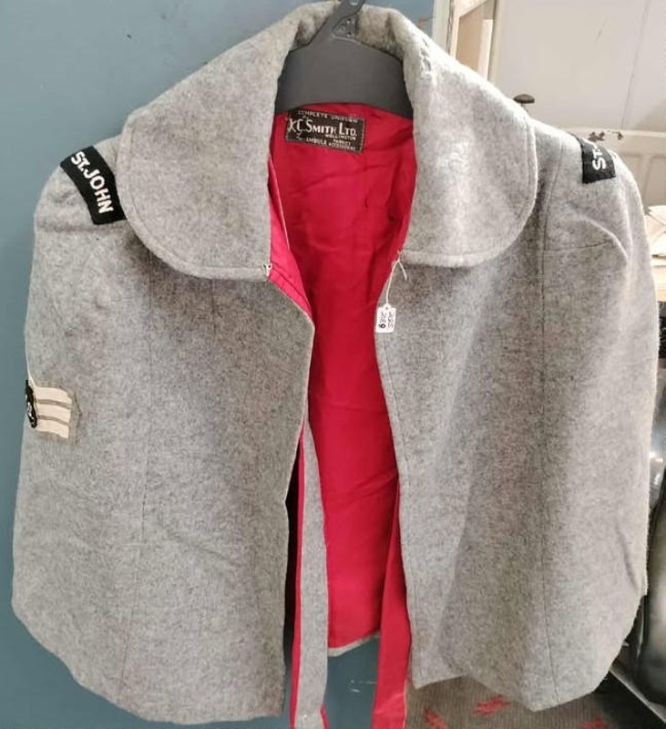 About this objectNurses Cape, made of grey wool and red lining. Black epaulettes with "ST JOHN" embroidered.
