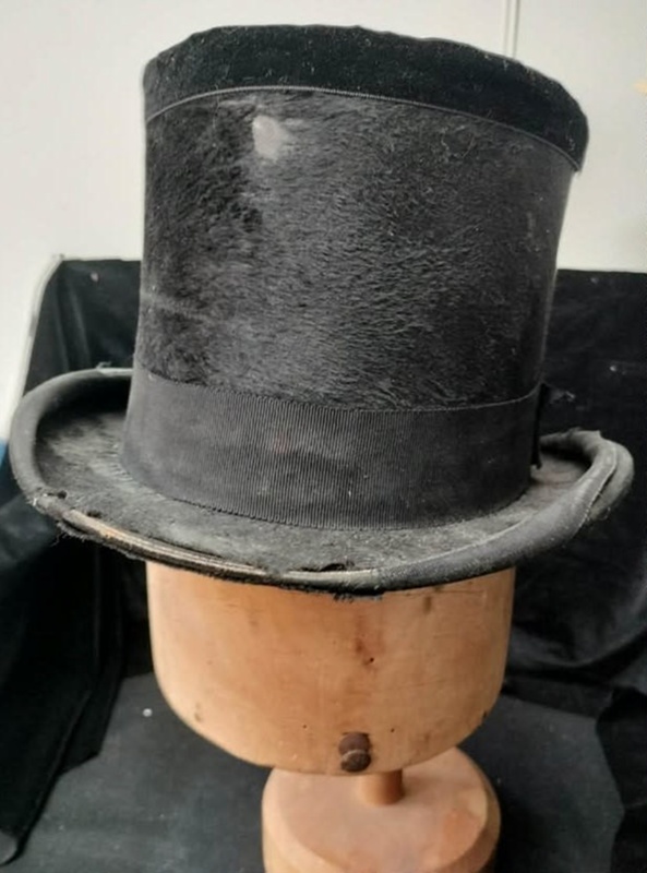 About this objectSilk Plush Black Top Hat. Oval shaped top, brim edged with cotton ribbon and with upturned sides. Wide black ribbon around base.