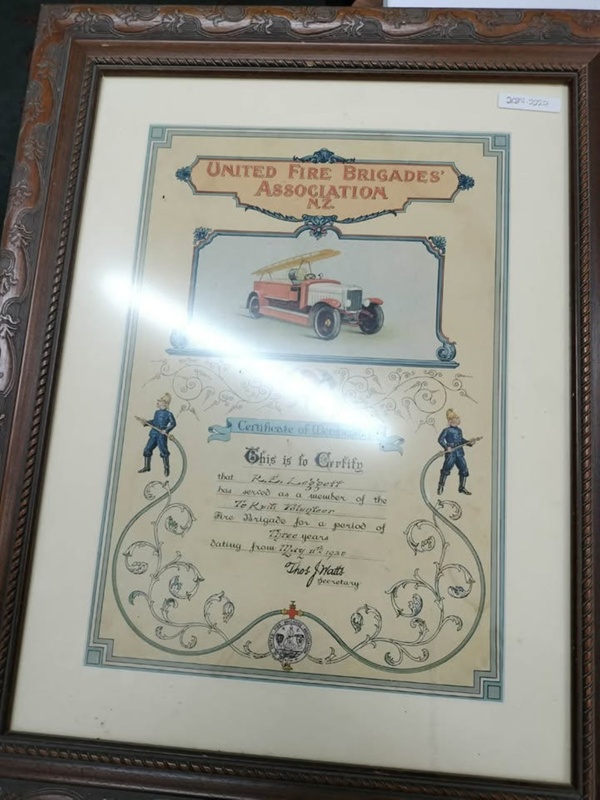 About this objectCertificate reads "United Fire Brigades' Association N. Z., Certificate of Membership, This is to Certify, that R. L. Leggett, has served as a member of the Te Kuiti Volunteer Fire Brigade for a period of Three Years, Dating from May 11th 1938, Thos. J. Watts, Secretary. Mounted in a wooden carved frame.