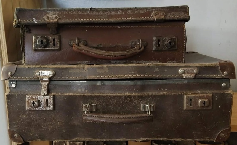 About this object2 coated cardboard suitcases with handles, stitching and metal locking catches. Larger one is a lightish brown while the smaller is a darker brown.